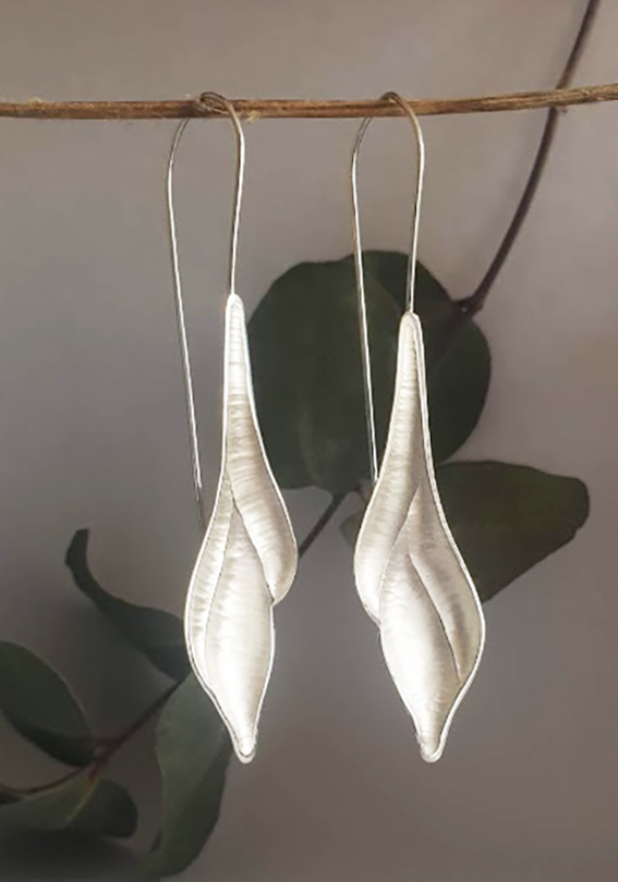 One of my favourite pairs of earrings in my jewellery box. You will often see me wearing these in the gallery, they are a statement pair of earring’s that has a lot impact. The wave chased pattern detail is eye catching and Cathy has rather cleverly designed these to frame the wearers face creating an elegant organic curved edge. As always they are very light for a statement earring.