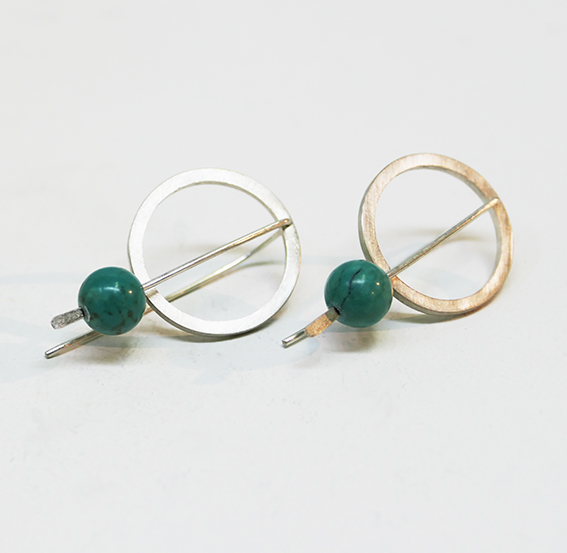 These dial earrings are a top seller in the gallery. The simplicity of shapes creates a kinetic rhythm found in the stone and beautifully hand pierced circle disk. When worn they look stunning on and the movement creates the point of curiosity. These dial earrings incorporate the very popular turquoise stone.