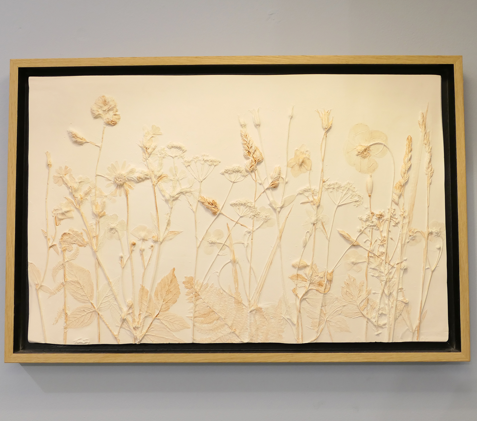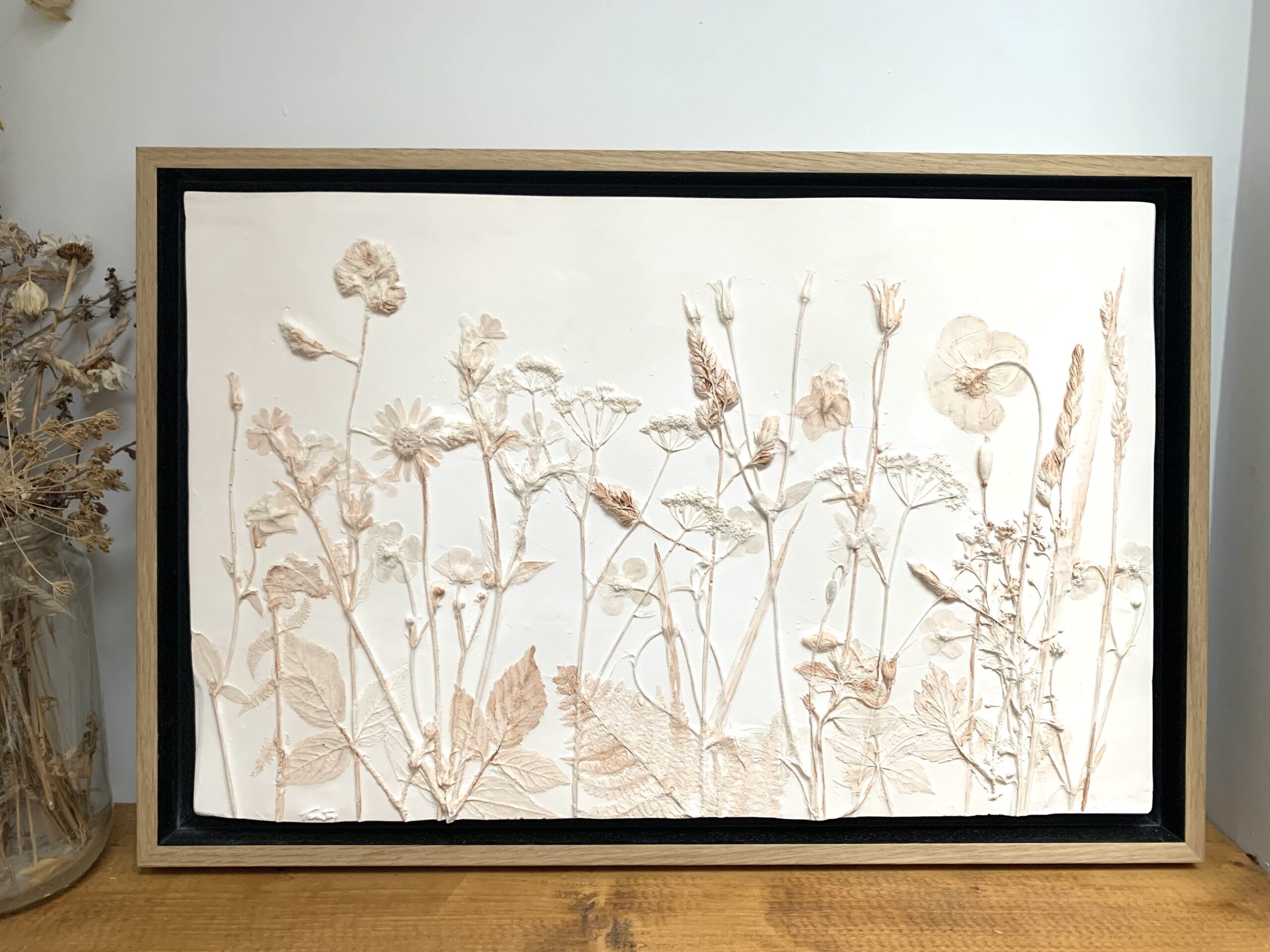 The flowers have been hand pressed into the clay and then carefully removed, creating an impression that will last forever, then professional plaster is poured into the clay to create a relief cast.