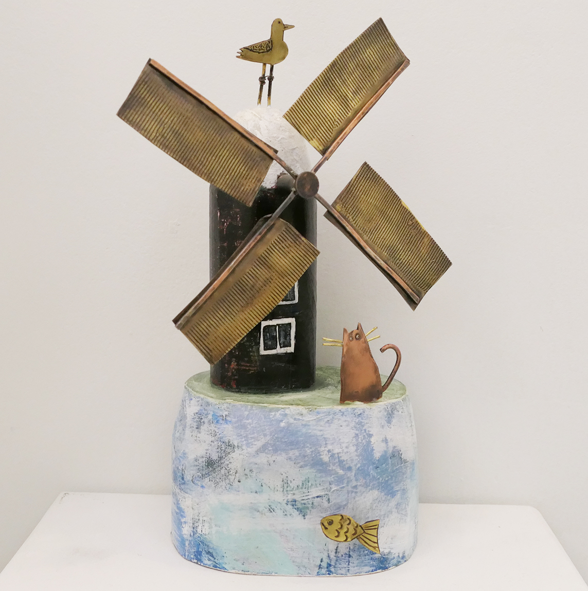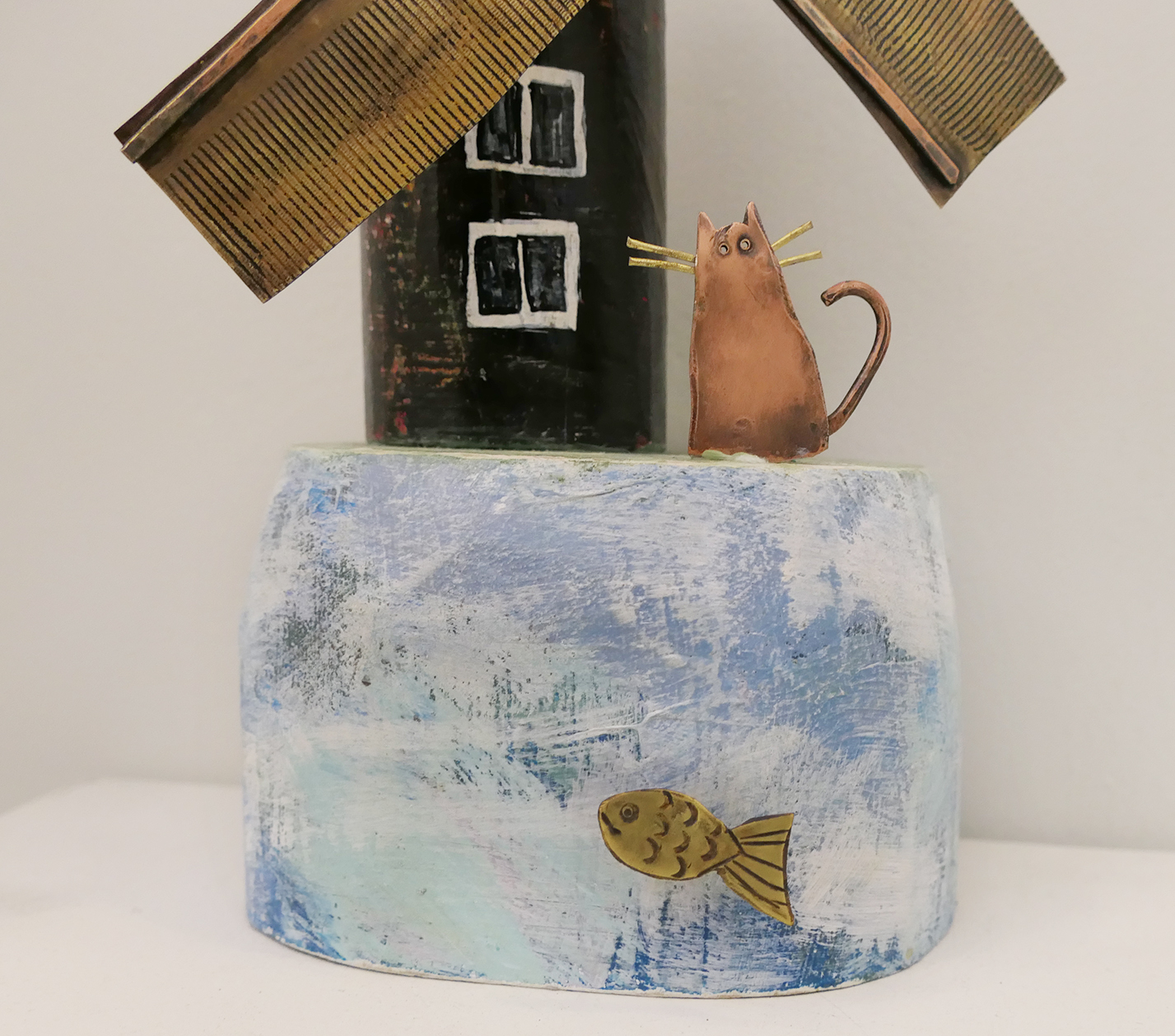 Beautifully detailed brass and copper Windmill, Cat and Bird by Frances Noon. We love how the Windmill is made out of wood and the rotor is made out of Brass and copper. Frances has also added detail by stamping the metal with individual patterns.