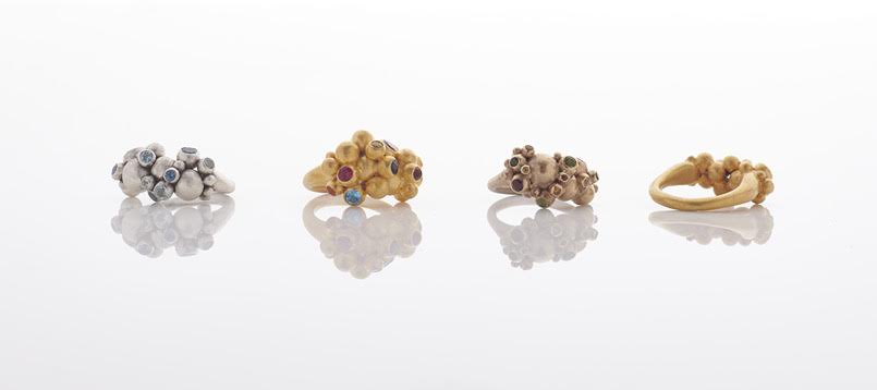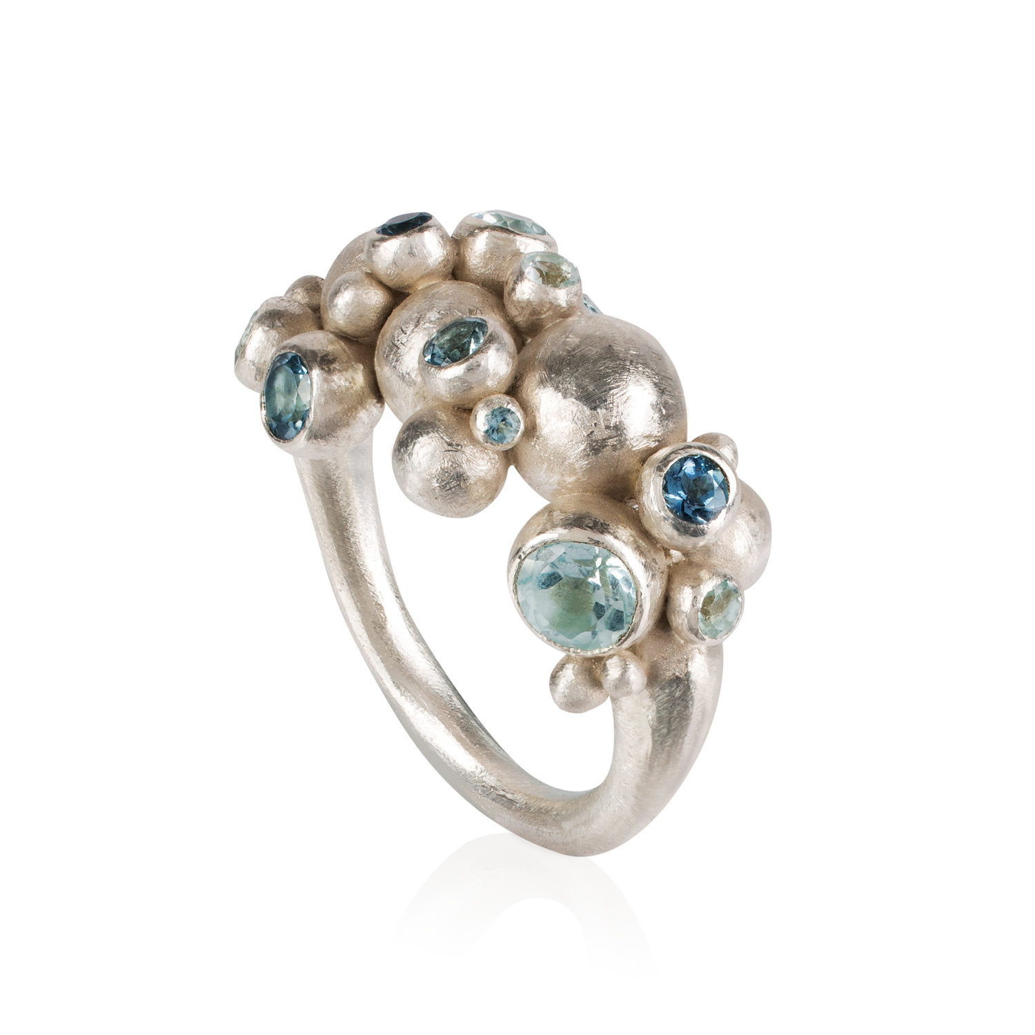 A beautiful statement cluster ring by a new maker to the gallery Roxanne Gilbert. We love these rings and the imaginitave design and concept. These rings sit beautifully on the hand as a cocktail ring which creates quite a statement.