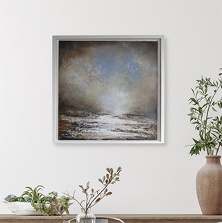 Acrylic on canvas board, framed in a painted white tray wood frame.